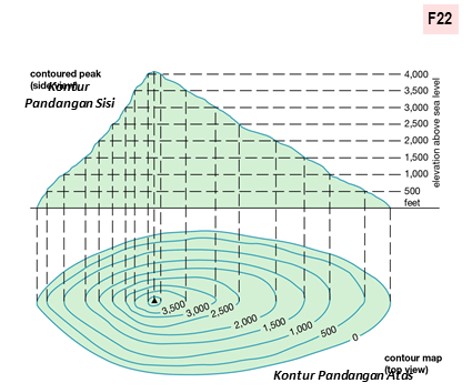 Garisan yang menunjukkan sela aras ketinggian sesuatu kawasan dalam skala besar (dalam pelan) yang dikira dari aras laut. (f34)