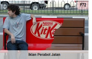 Pengiklanan pada objek atau peralatan yang bina di atas atau berdekatan jalan awam. Elemen perabot jalan ialah tong sampah, lampu, turapan laluan pejalan kaki, perhentian bas, pondok telefon dan lain-lain. (f133)