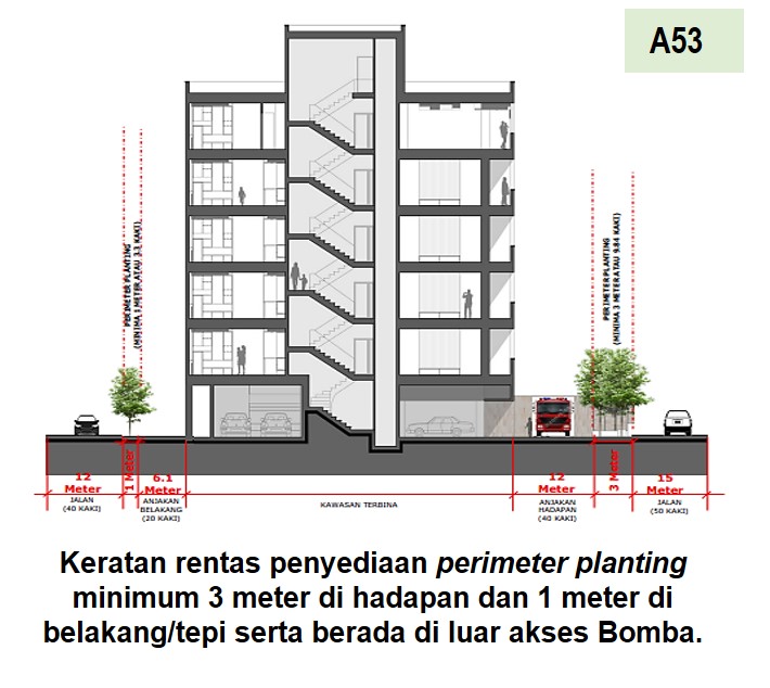 Tanaman yang disediakan di sekeliling kawasan pembangunan dan termasuk anjakan bangunan bagi mewujudkan keseimbangan di antara struktur bangunan yang kejur dengan alam.