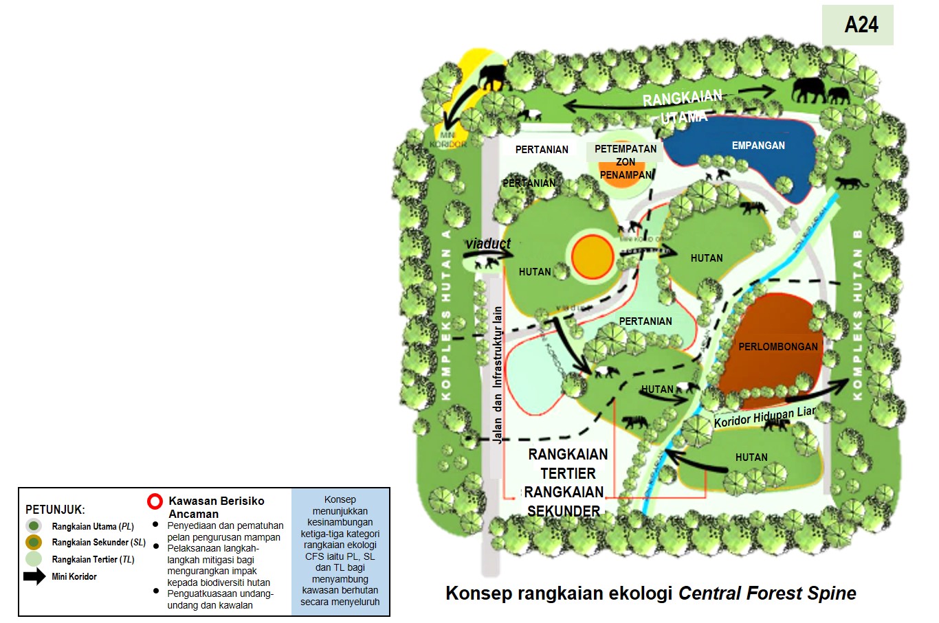 Habitat hutan yang menyambung atau membolehkan pergerakan hidupan liar antara pulau hutan di dalam kawasan Central Forest Spine (CFS) sama ada melalui rangkaian semula jadi sedia ada yang masih berhutan atau laluan pergerakan seperti sungai, lembah dan permatang. Rangkaian ekologi berbentuk fizikal, mempunyai ruang geografi yang jelas dan diurus tadbir dalam jangka masa panjang untuk mengekalkan atau memulihkan hubungan ekologi yang berkesan.
