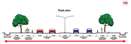 Kawasan yang telah ditentukan kelebarannya mengikut perundangan di mana ianya termasuk laluan jalan berturap, bahu jalan, laluan pejalan kaki, ruang udara di atasnya dan semua kawasan yang berada dalam lingkungan sempadannya yang diwartakan di bawah seksyen 62, Kanun Tanah Negara [Akta 828]. (f67)